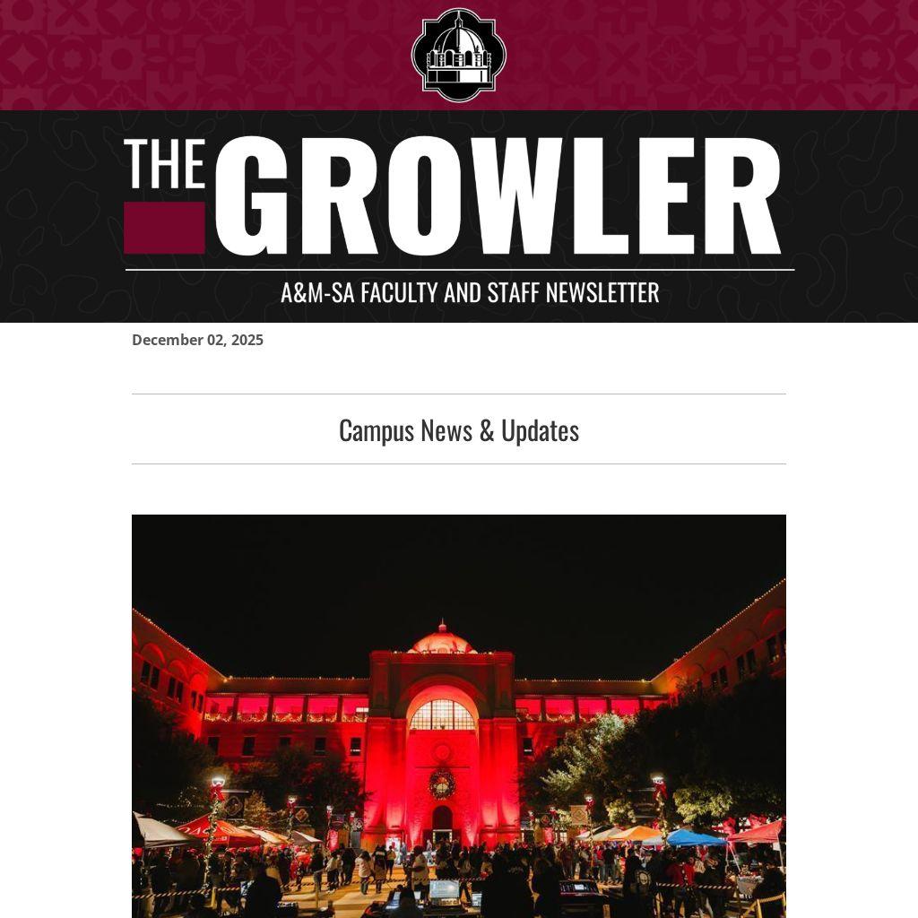 The Growler is the campus newsletter for faculty and staff of Texas A&M-San Antonio. The Growler is published every Tuesday from the start of the semester, providing insight into A&M-SA news, events, and announcements. If you would like to promote a University-wide event or announcement in The Growler, submit this form by 5 p.m. CT on a Monday the week before publication.