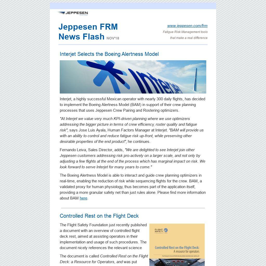 Fernando Leiva, Sales Director, adds, "We are delighted to see Interjet join other Jeppesen customers addressing risk pro-actively on a larger scale, and not only by adjusting a few flights at the end of the process which has marginal impact on risk. We look forward to serve Interjet for many years to come."
