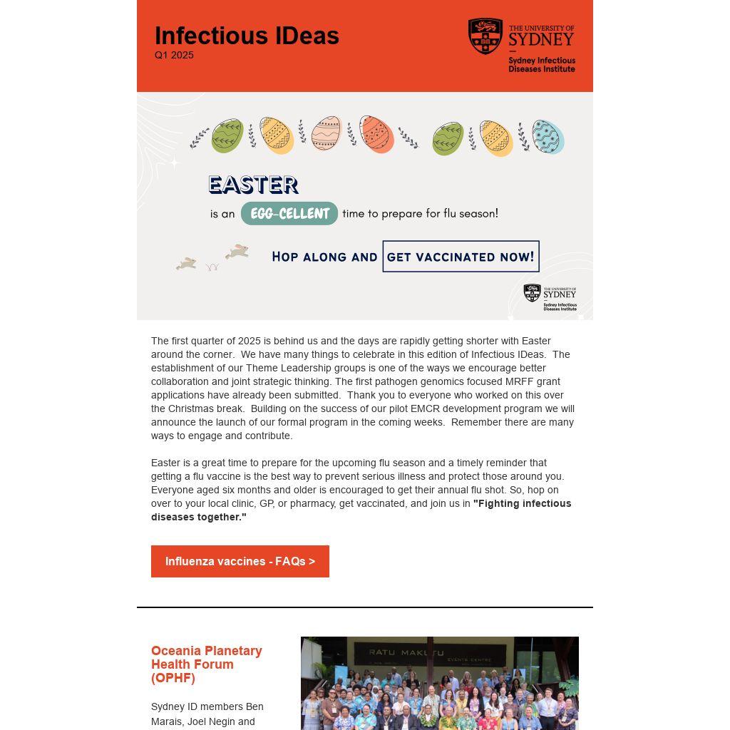 The first quarter of 2025 is behind us and the days are rapidly getting shorter with Easter around the corner. We have many things to celebrate in this edition of Infectious IDeas. The establishment of our Theme Leadership groups is one of the ways we encourage better collaboration and joint strategic thinking. The first pathogen genomics focused MRFF grant applications have already been submitted. Thank you to everyone who worked on this over the Christmas break. Building on the success of our pilot EMCR development program we will announce the launch of our formal program in the coming weeks. Remember there are many ways to engage and contribute.