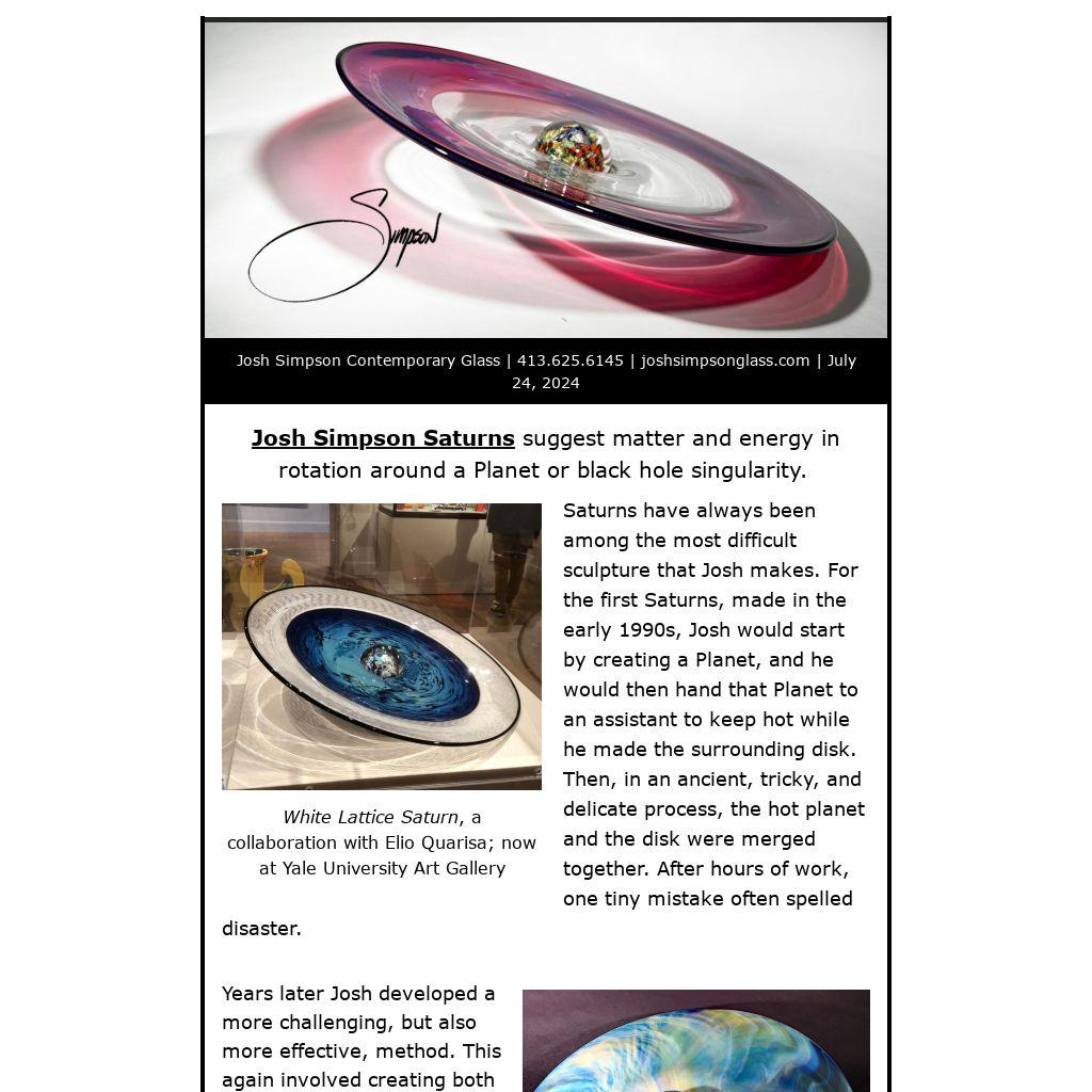 Saturns have always been among the most difficult sculpture that Josh makes. For the first Saturns, made in the early 1990s, Josh would start by creating a Planet, and he would then hand that Planet to an assistant to keep hot while he made the surrounding disk. Then, in an ancient, tricky, and delicate process, the hot planet and the disk were merged together. After hours of work, one tiny mistake often spelled disaster.