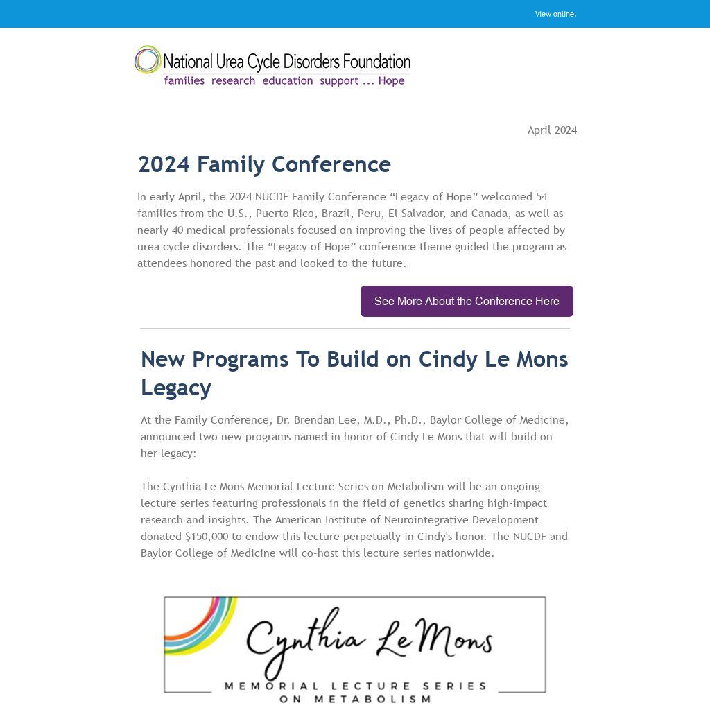 In early April, the 2024 NUCDF Family Conference “Legacy of Hope” welcomed 54 families from the U.S., Puerto Rico, Brazil, Peru, El Salvador, and Canada, as well as nearly 40 medical professionals focused on improving the lives of people affected by urea cycle disorders. The “Legacy of Hope” conference theme guided the program as attendees honored the past and looked to the future.