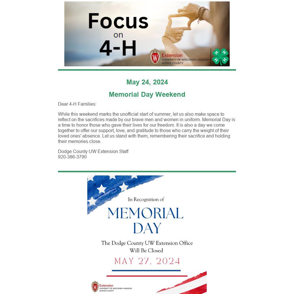 If clubs or groups have items to share, send them by noon on Thursday to be included in that week’s issue. Anything received after 12 p.m. Thursday will be considered for the following week. The articles should be sent to Marie at marie.witzel@wisc.edu. You can also contact the office with any questions. Thanks!