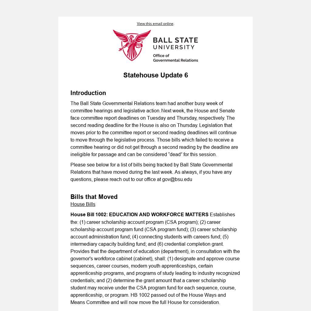 Please see below for a list of bills being tracked by Ball State Governmental Relations that have moved during the last week. As always, if you have any questions, please reach out to our office at gov@bsu.edu