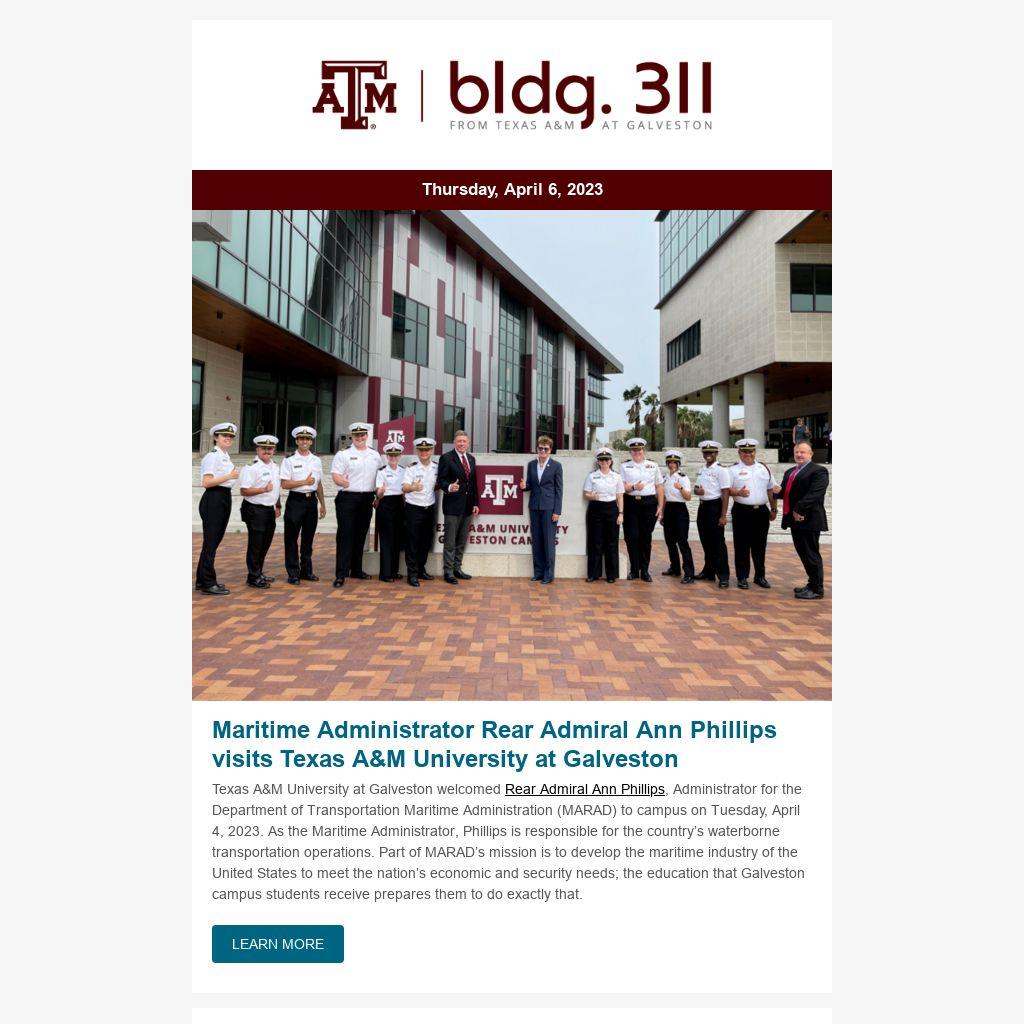 Texas A&M University at Galveston welcomed Rear Admiral Ann Phillips, Administrator for the Department of Transportation Maritime Administration (MARAD) to campus on Tuesday, April 4, 2023. As the Maritime Administrator, Phillips is responsible for the country’s waterborne transportation operations. Part of MARAD’s mission is to develop the maritime industry of the United States to meet the nation’s economic and security needs; the education that Galveston campus students receive prepares them to do exactly that.
