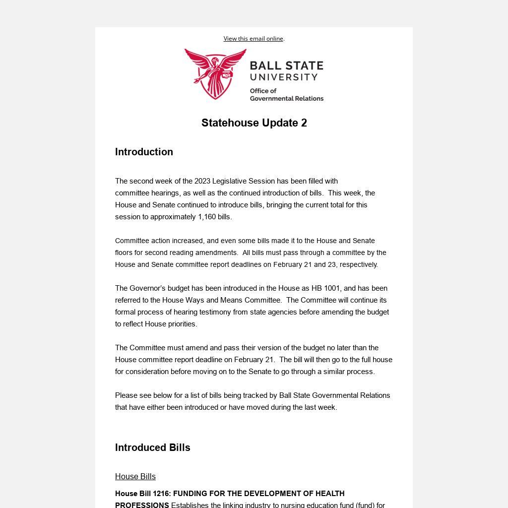 Please see below for a list of bills being tracked by Ball State Governmental Relations that have either been introduced or have moved during the last week.