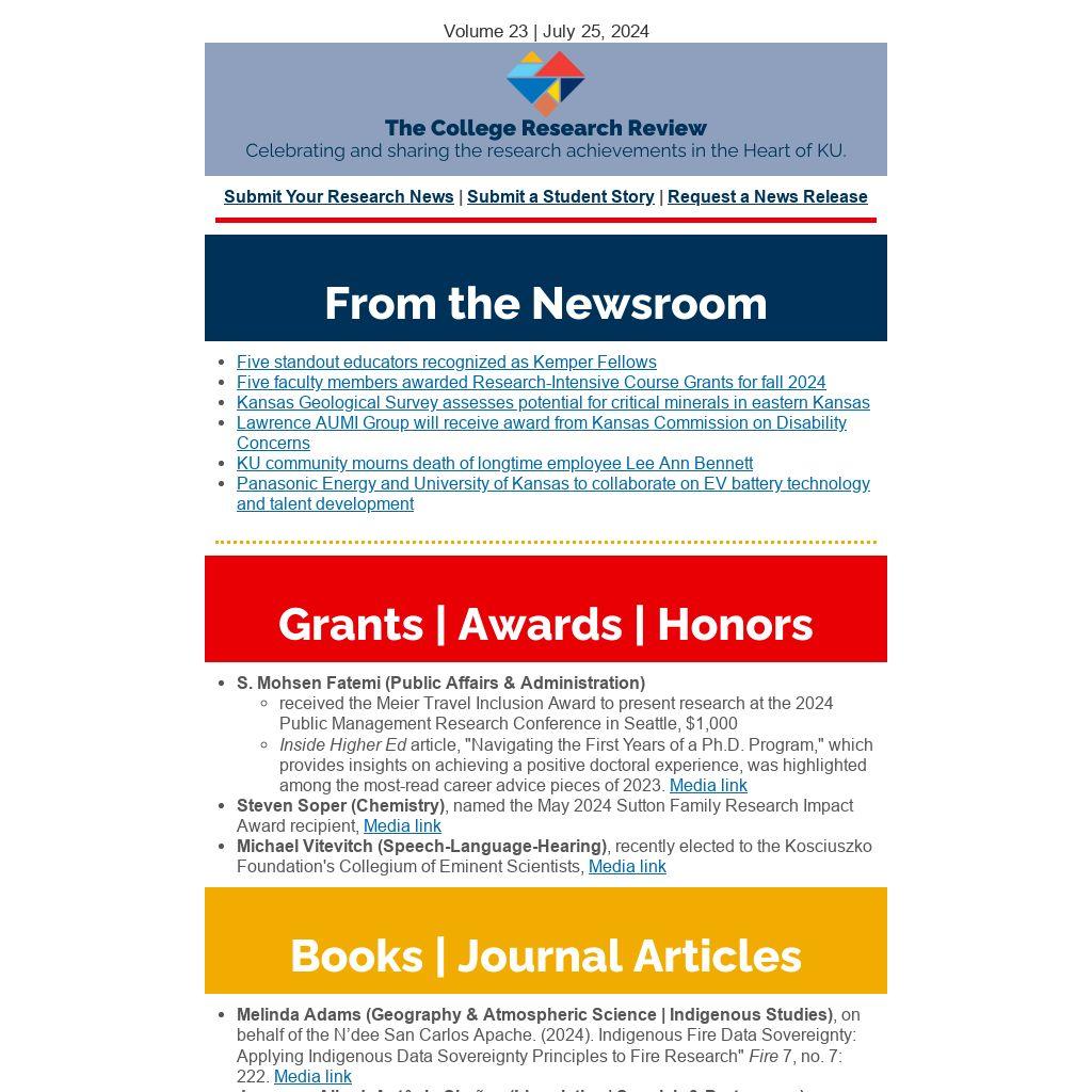 The FRESSH Program is designed to help scholars in the arts, social sciences, and humanities in the College of Liberal Arts and Sciences apply for and obtain external funding for their research. The program will consist of workshops during the 2024-25 academic year during which scholars will work with invited guests and one another to develop a proposal suitable for submitting to an external funding agency such as the NEH, ACLS, NSF, or a foundation or residential fellowship program outside the University of Kansas. The program will introduce participants to resources internal to KU and facilitate the development of proposals. The program also aims to develop community and collaboration among participants. Deadline is Aug. 19, 2024.