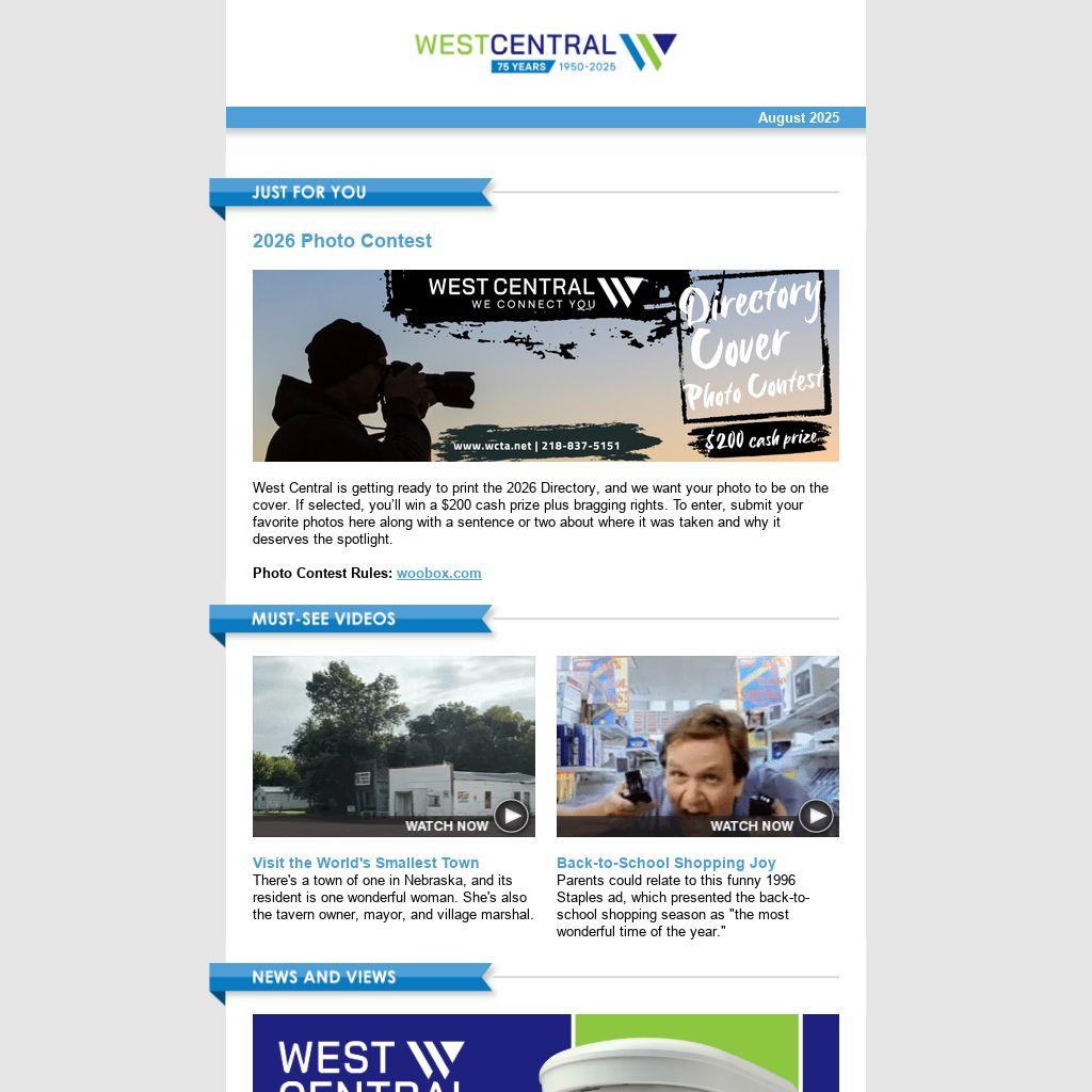 West Central is getting ready to print the 2026 Directory, and we want your photo to be on the cover. If selected, you’ll win a $200 cash prize plus bragging rights. To enter, submit your favorite photos here along with a sentence or two about where it was taken and why it deserves the spotlight. Photo Contest Rules: woobox.com |
