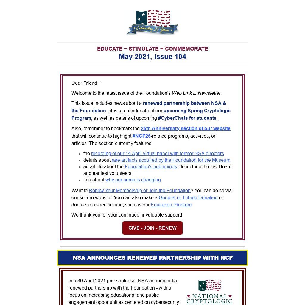 Our 2021 Spring Cryptologic Program will take place virtually via Zoom webinar on 13 May at 11am EDT, and will feature Dr. Robert Spalding, Brig Gen, USAF (Ret).