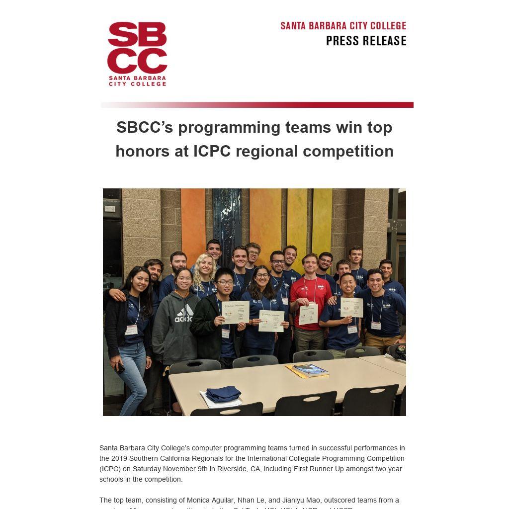 Santa Barbara City College’s computer programming teams turned in successful performances in the 2019 Southern California Regionals for the International Collegiate Programming Competition (ICPC) on Saturday November 9th in Riverside, CA, including First Runner Up amongst two year schools in the competition.