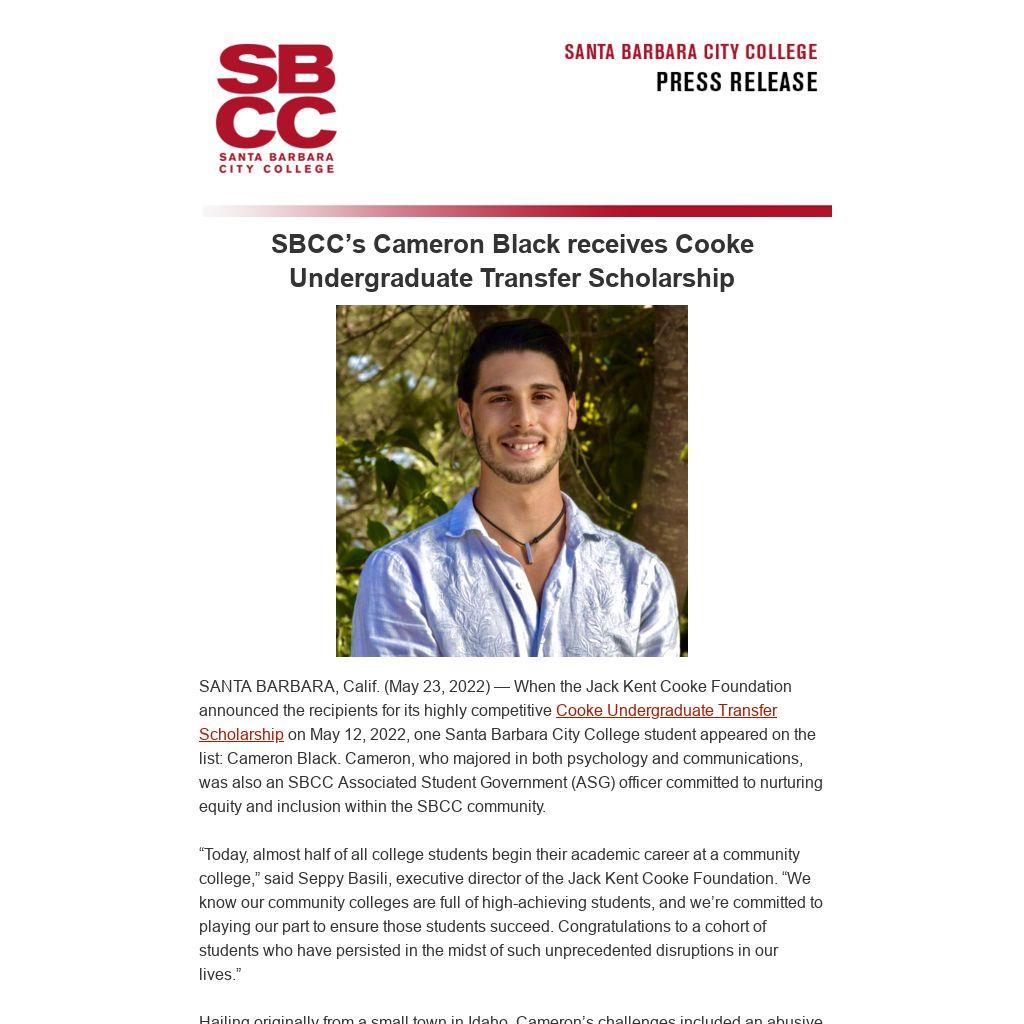 SBCC’s Cameron Black receives Cooke Undergraduate Transfer Scholarship
