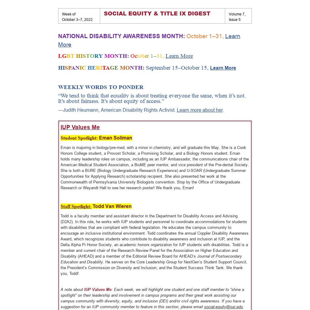 Digest issues are emailed every Monday morning. Send all information concerning your event to social-equity@iup.edu, and we will include it in the appropriate weekly issue. Also, please be sure to enter your event in the CMS on the DIVERSITY, STUDENT, and CENTRAL CALENDARS so that it will receive wider marketing, appear in IUP Now, and achieve greater attendance.