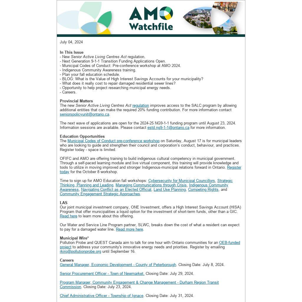 *Disclaimer: The Association of Municipalities of Ontario (AMO) is unable to provide any warranty regarding the accuracy or completeness of third-party submissions. Distribution of these items does not imply an endorsement of the views, information or services mentioned.