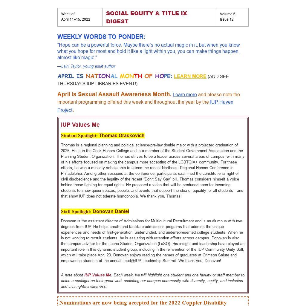 Digest issues are emailed every Monday morning. Send all information concerning your event to social-equity@iup.edu, and we will include it in the appropriate weekly issue. And, please be sure to enter your event in the CMS through the DIVERSITY, STUDENT, and CENTRAL CALENDARS so that it will receive wider marketing, appear in IUP Now, and achieve greater attendance.