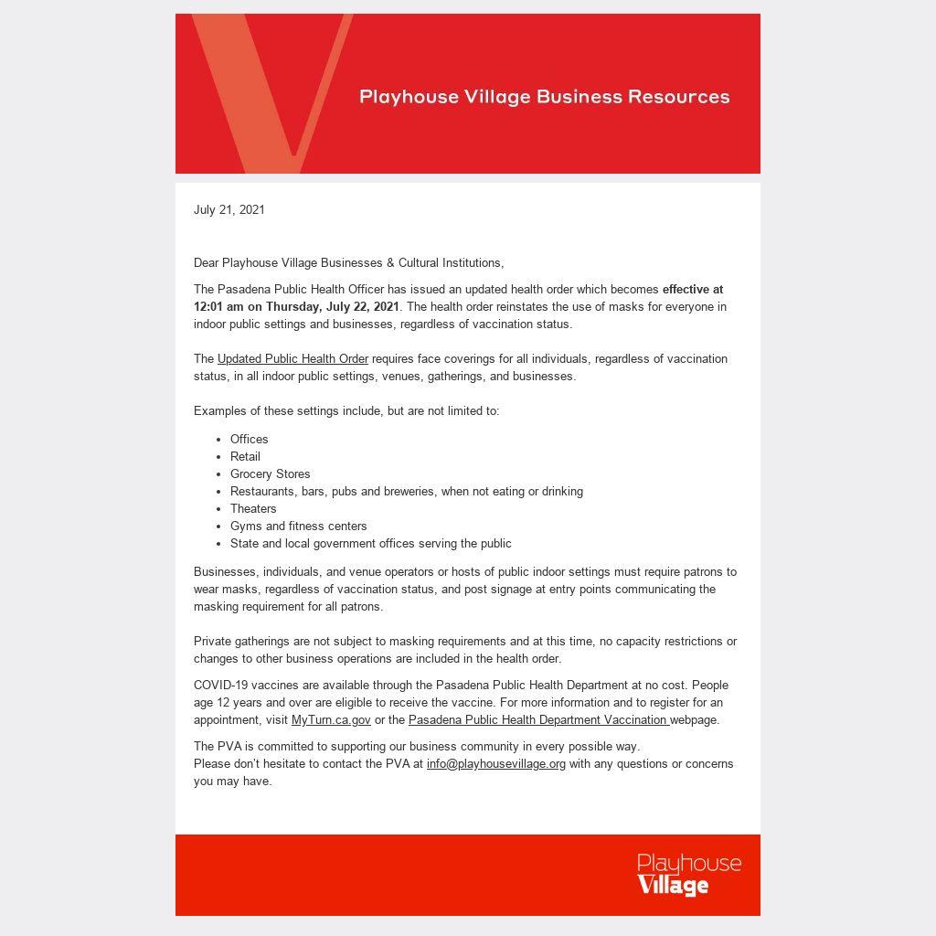 The Pasadena Public Health Officer has issued an updated health order which becomes effective at 12:01 am on Thursday, July 22, 2021. The health order reinstates the use of masks for everyone in indoor public settings and businesses, regardless of vaccination status.