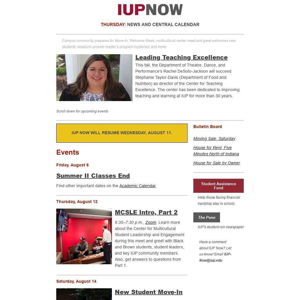 Distributed to IUP employees and students three days a week on its summer schedule, IUP Now is the official newsletter of Indiana University of Pennsylvania. It features news from across the IUP website, compiled by the Division of Marketing and Communications. Find out how to get your news and events in IUP Now.