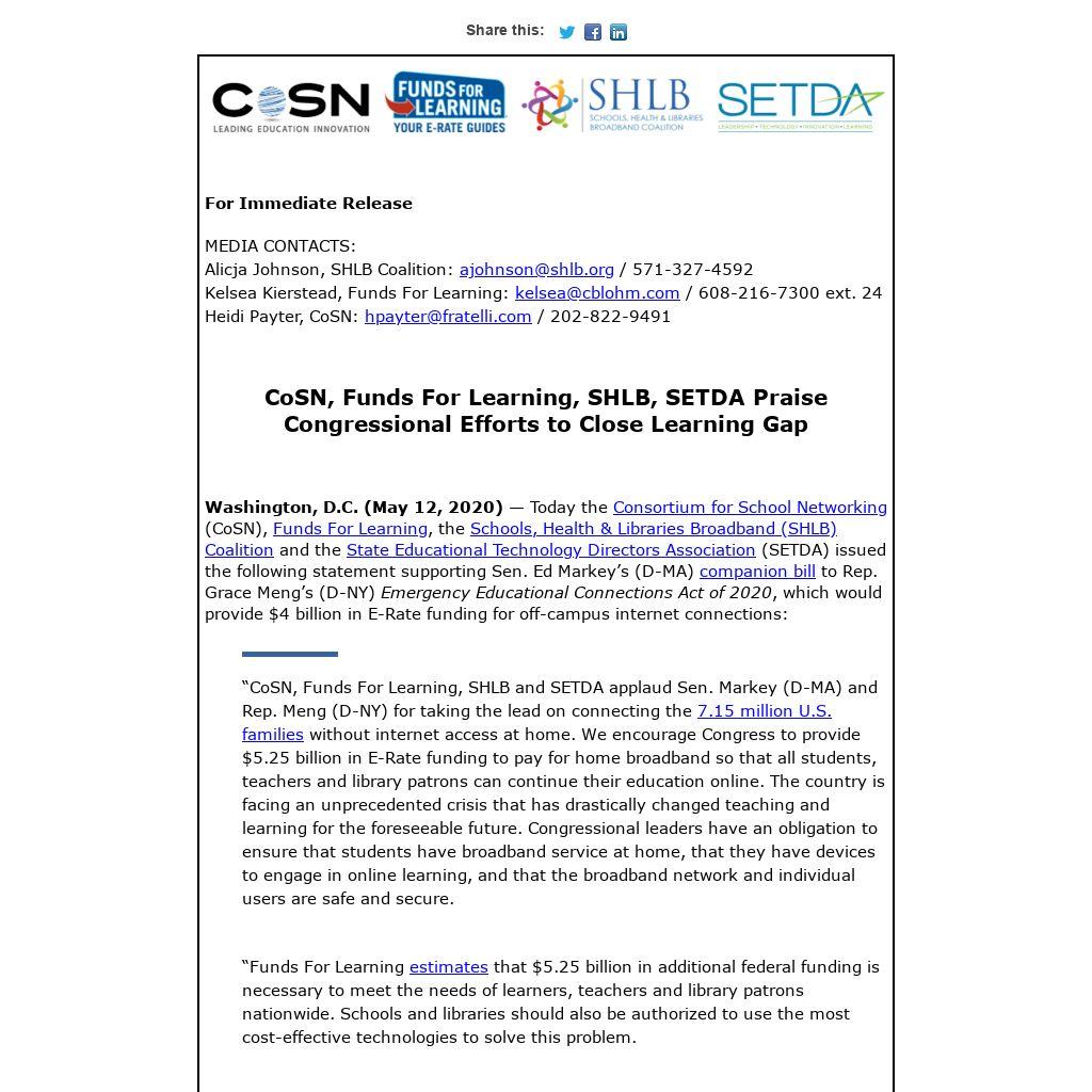 “CoSN, Funds For Learning, SHLB and SETDA applaud Sen. Markey (D-MA) and Rep. Meng (D-NY) for taking the lead on connecting the 7.15 million U.S. families without internet access at home. We encourage Congress to provide $5.25 billion in E-Rate funding to pay for home broadband so that all students, teachers and library patrons can continue their education online. The country is facing an unprecedented crisis that has drastically changed teaching and learning for the foreseeable future. Congressional leaders have an obligation to ensure that students have broadband service at home, that they have devices to engage in online learning, and that the broadband network and individual users are safe and secure.