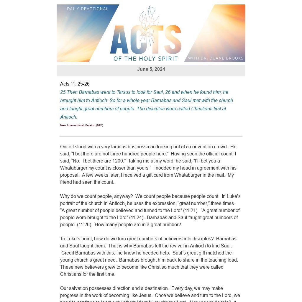 Why do we count people, anyway? We count people because people count. In Luke’s portrait of the church in Antioch, he uses the expression, “great number,” three times. “A great number of people believed and turned to the Lord” (11:21). “A great number of people were brought to the Lord” (11:24). Barnabas and Saul taught great numbers of people (11:26). How many people are in a great number?