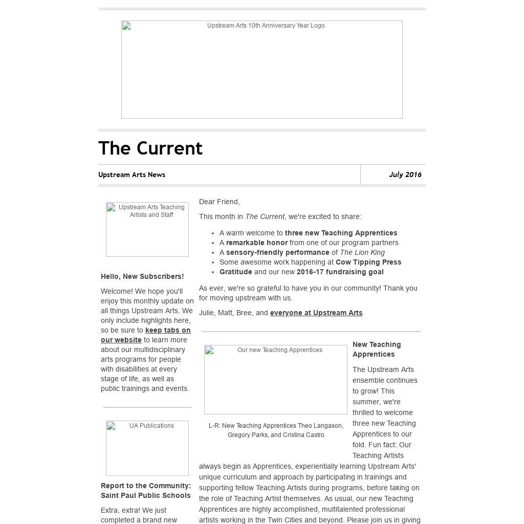 Therefore, we're excited to announce that our fundraising goal for this new 2016-17 fiscal year is, once again, a full $100,000. As we've sifted through evaluations from the past twelve months to create the Report to the Community mentioned above, we've loved reading comments like this one from a Special Education teacher in St. Paul: “So many successes!!!! This session of Upstream Arts was a total home run as far as reaching deep into the social and emotional needs of our students.” You, our community, continually inspire us to keep building on this momentum - to keep moving upstream.