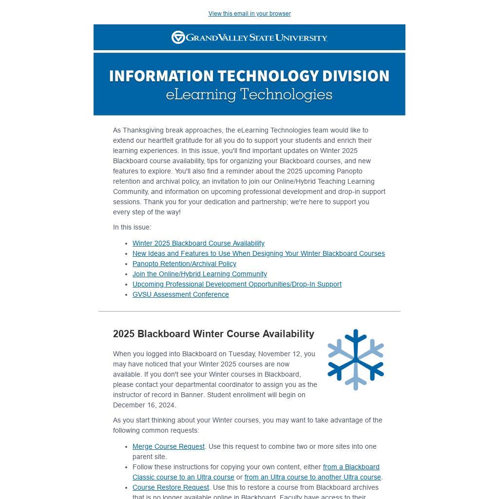 The eLearning team is here to help you maximize the potential of our learning management system! Join our team every Wednesday for Blackboard Ultra Lunch and Learn virtual office hours, where eLearning staff will be ready to help you from 12 to 12:30pm using this Zoom link. If this time doesn't work, remember that your eLearning Liaison is always available for consultations.