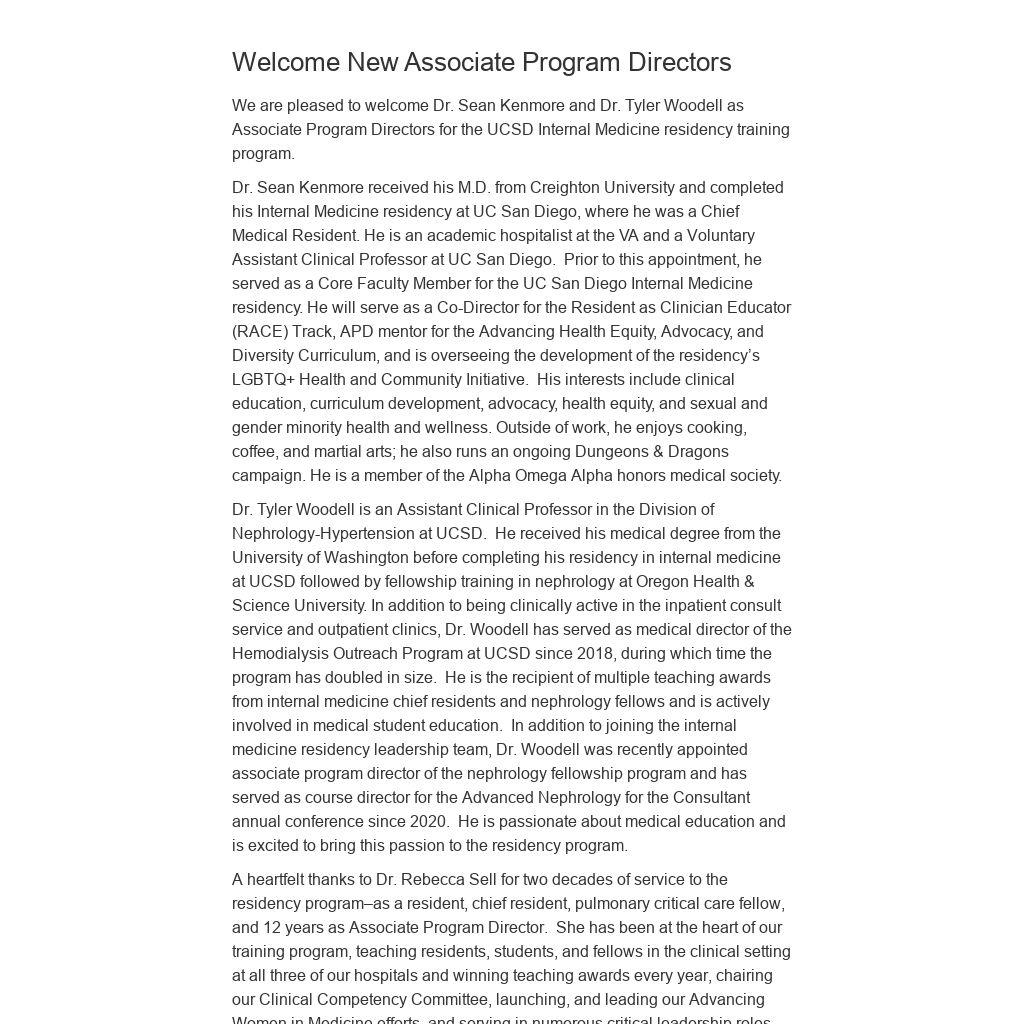 We are pleased to welcome Dr. Sean Kenmore and Dr. Tyler Woodell as Associate Program Directors for the UCSD Internal Medicine residency training program.
