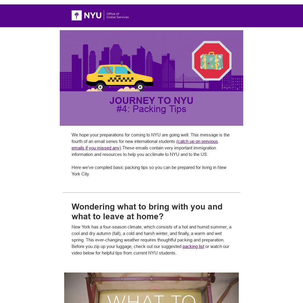 NYU International Students, a Facebook community group where you can talk with other students before even coming to the US. You can use the group to ask questions about immigration or life at NYU and in NYC. You can also share resources, internships, and events, or buy and sell potentially useful items, such as textbooks and furniture.