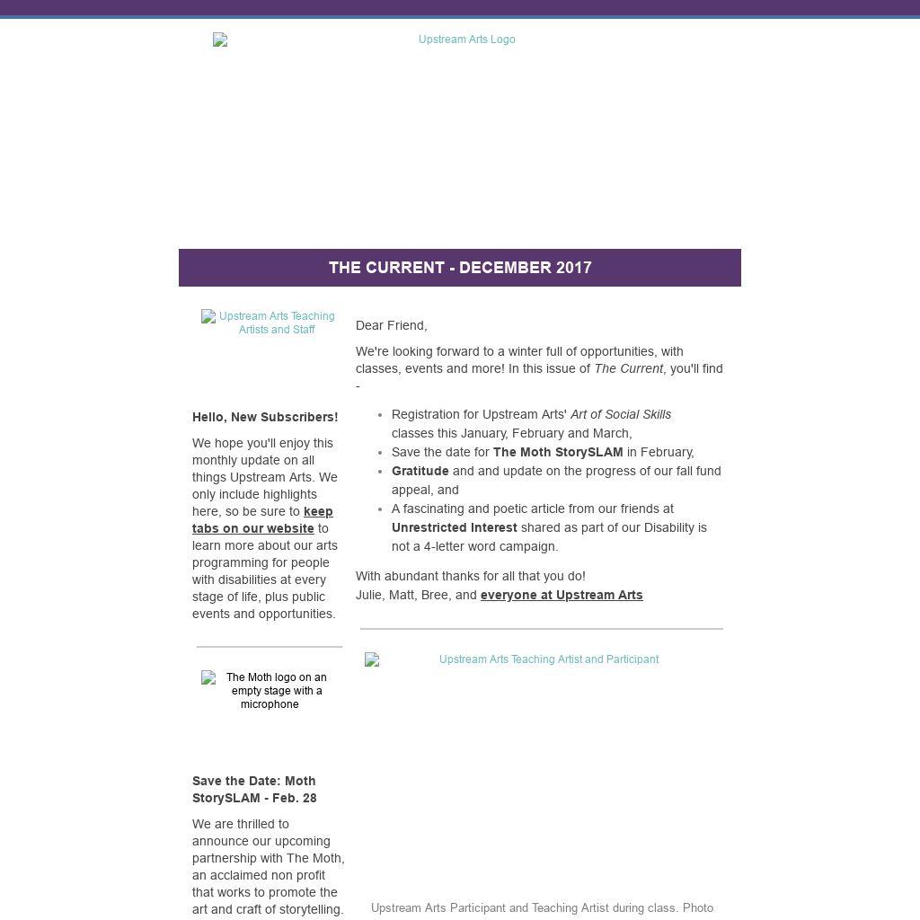 We're looking forward to a winter full of opportunities, with classes, events and more! In this issue of The Current, you'll find - - Registration for Upstream Arts' Art of Social Skills classes this January, February and March,
