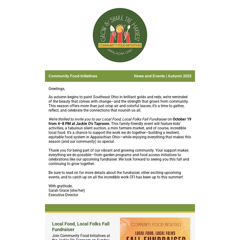 We’re thrilled to invite you to our Local Food, Local Folks Fall Fundraiser on October 19 from 4–8 PM at Jackie O’s Taproom. This family-friendly event will feature kids’ activities, a fabulous silent auction, a mini farmers market, and of course, incredible local food. It’s a chance to support the work we do together—building a resilient, equitable food system in Appalachian Ohio—while enjoying everything that makes this season (and our community) so special.