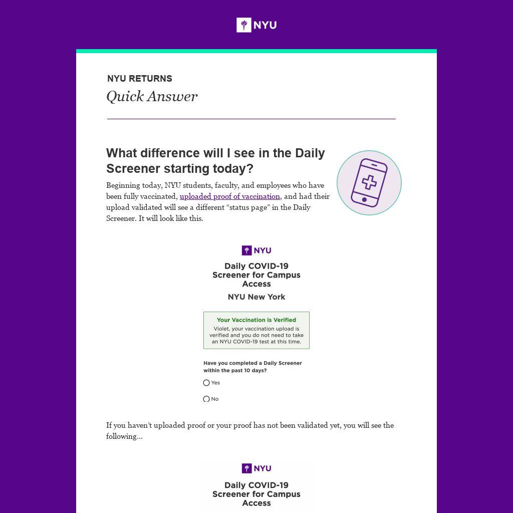 Remember, whether or not you have been fully vaccinated, you still need to complete the Daily Screener on any day you’re going to access an NYU building.