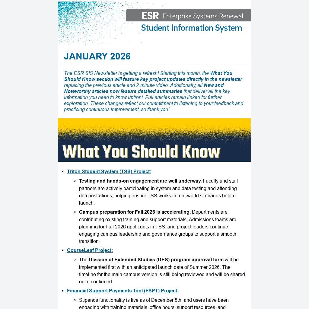 Beginning in Fall Quarter 2025, the TSS Project hosted a series of live demonstrations to introduce key features of the new student information system and help ease campus concerns ahead of its Summer 2026 launch. Four well-attended sessions showcased student experience tools, new grading functionality, and DES–specific scheduling processes, while allowing participants to ask questions in real time. These demonstrations were made possible through collaboration across project teams and subject matter experts, with recordings and resources available and additional demonstrations planned for Winter and Spring 2026.