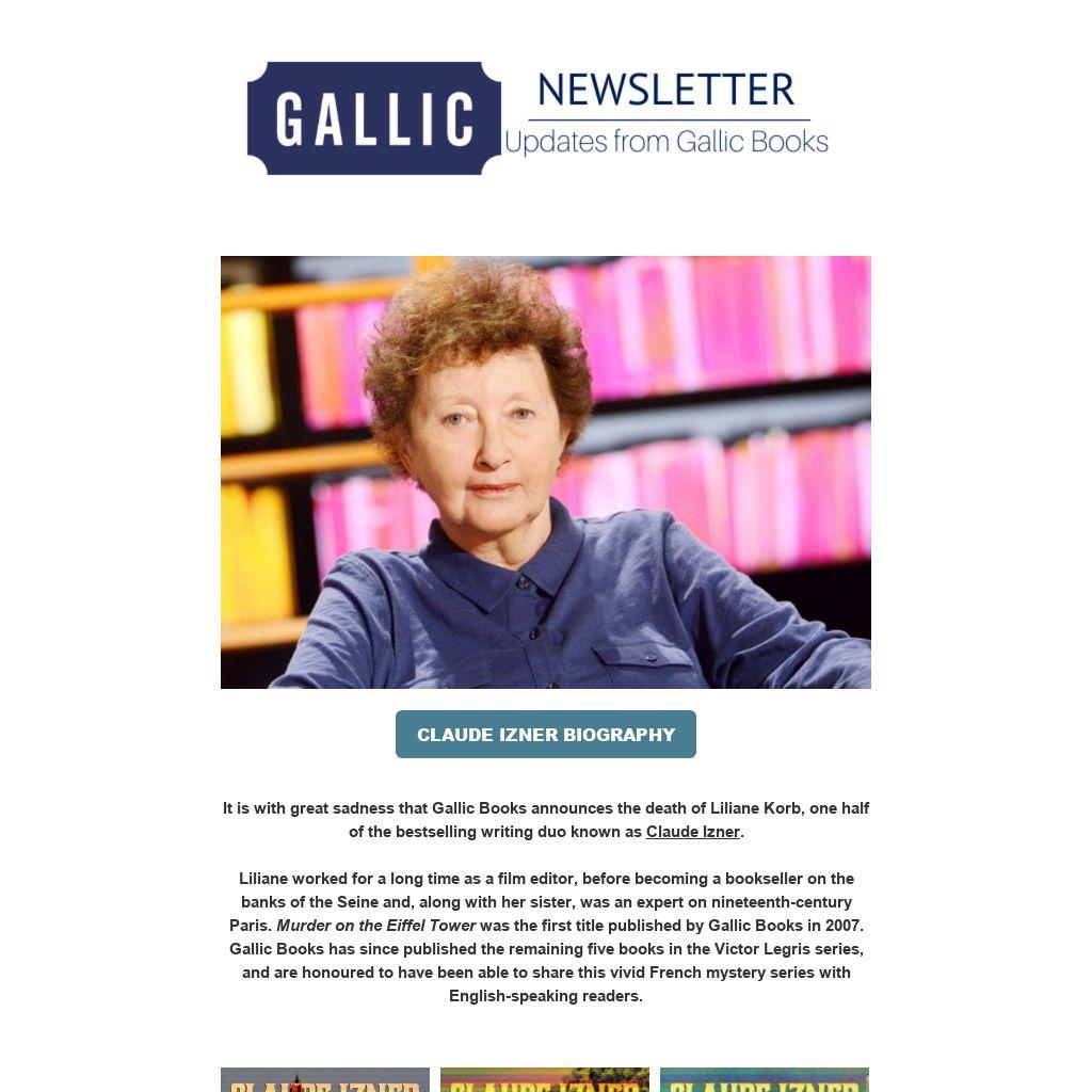 It is with great sadness that Gallic Books announces the death of Liliane Korb, one half of the bestselling writing duo known as Claude Izner.