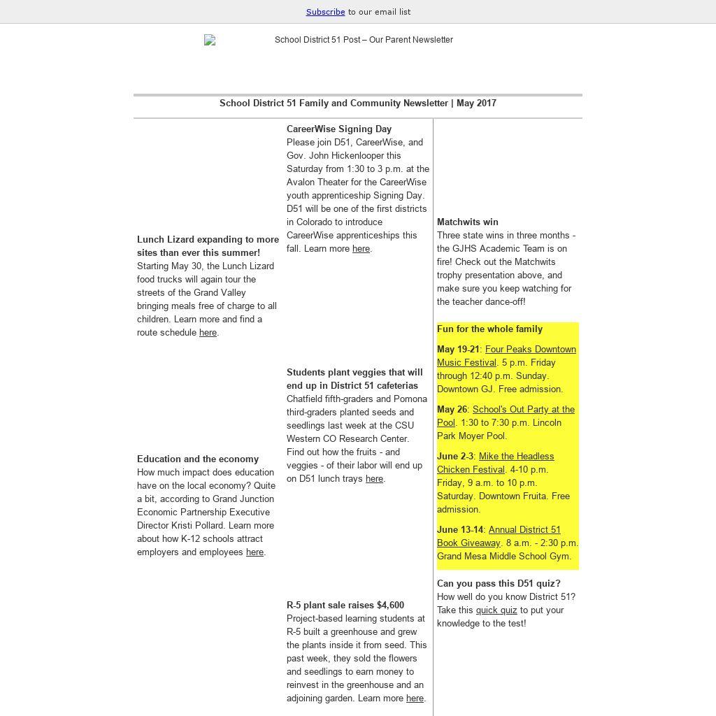Please join D51, CareerWise, and Gov. John Hickenlooper this Saturday from 1:30 to 3 p.m. at the Avalon Theater for the CareerWise youth apprenticeship Signing Day. D51 will be one of the first districts in Colorado to introduce CareerWise apprenticeships this fall. Learn more here.