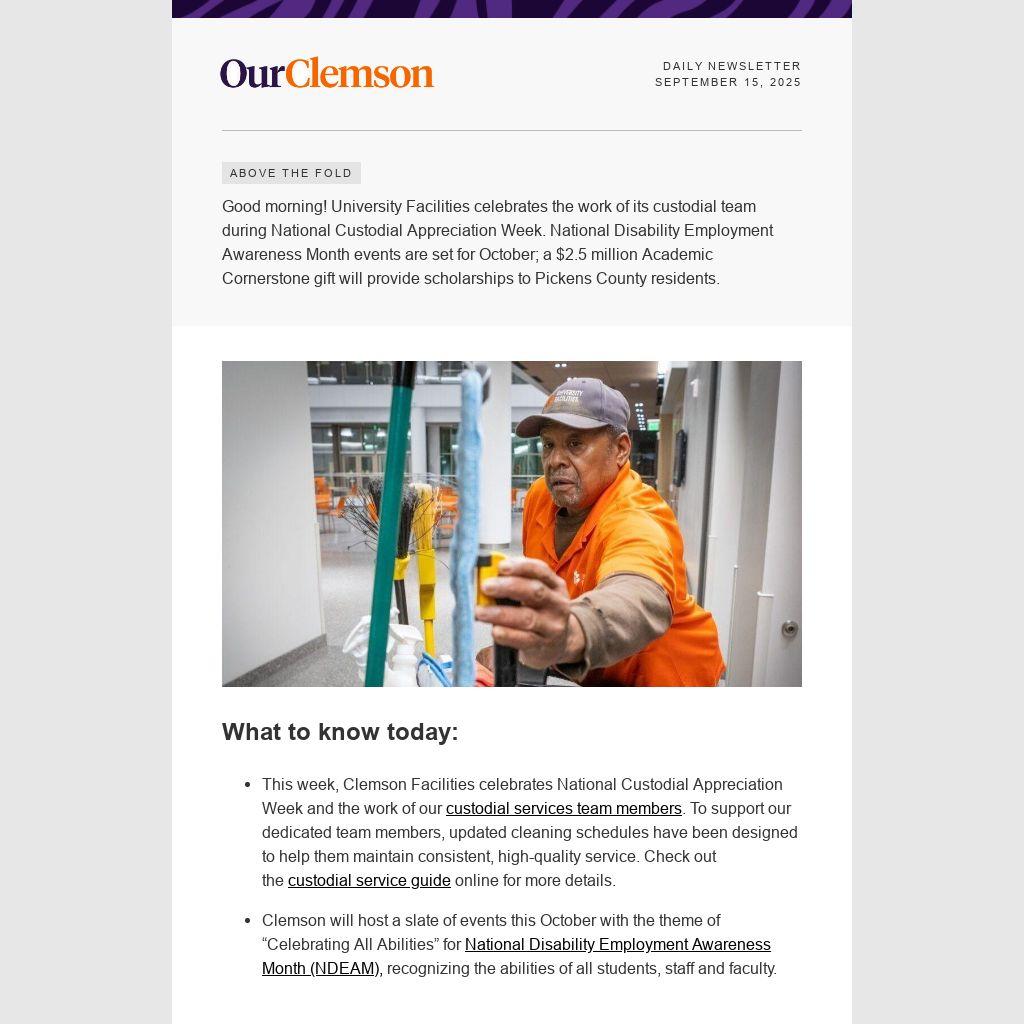 Good morning! University Facilities celebrates the work of its custodial team during National Custodial Appreciation Week. National Disability Employment Awareness Month events are set for October; a $2.5 million Academic Cornerstone gift will provide scholarships to Pickens County residents.