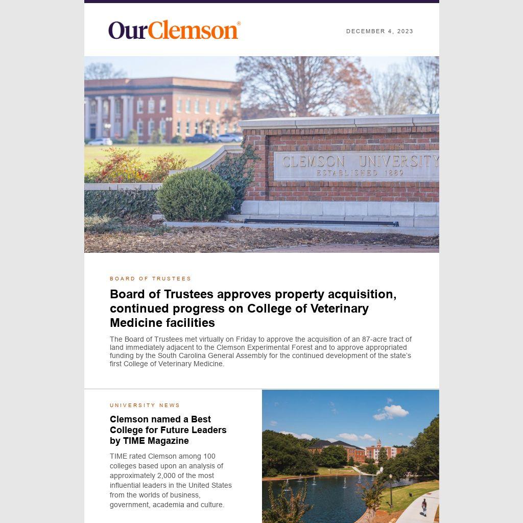 The Board of Trustees met virtually on Friday to approve the acquisition of an 87-acre tract of land immediately adjacent to the Clemson Experimental Forest and to approve appropriated funding by the South Carolina General Assembly for the continued development of the state’s first College of Veterinary Medicine.