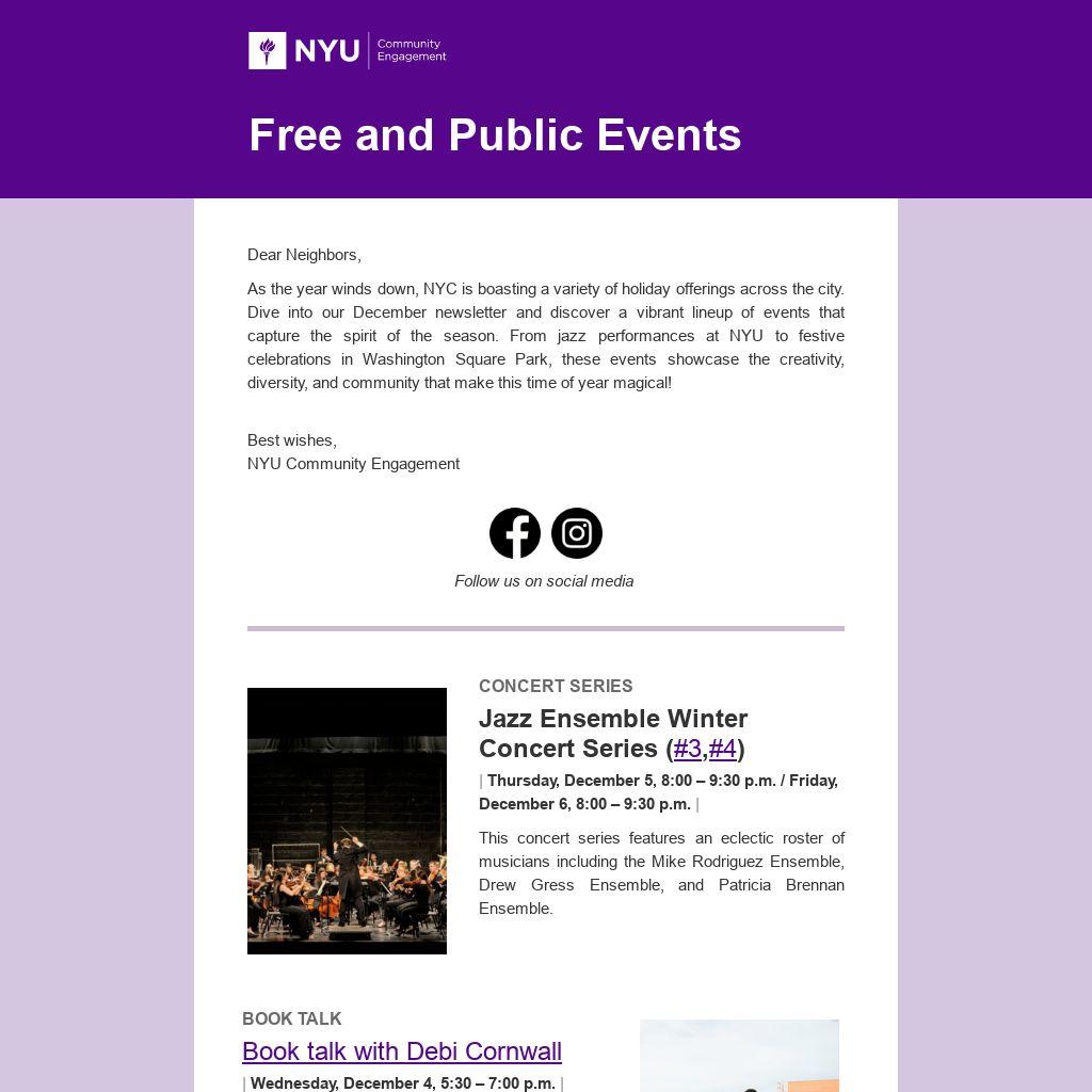 As the year winds down, NYC is boasting a variety of holiday offerings across the city. Dive into our December newsletter and discover a vibrant lineup of events that capture the spirit of the season. From jazz performances at NYU to festive celebrations in Washington Square Park, these events showcase the creativity, diversity, and community that make this time of year magical!