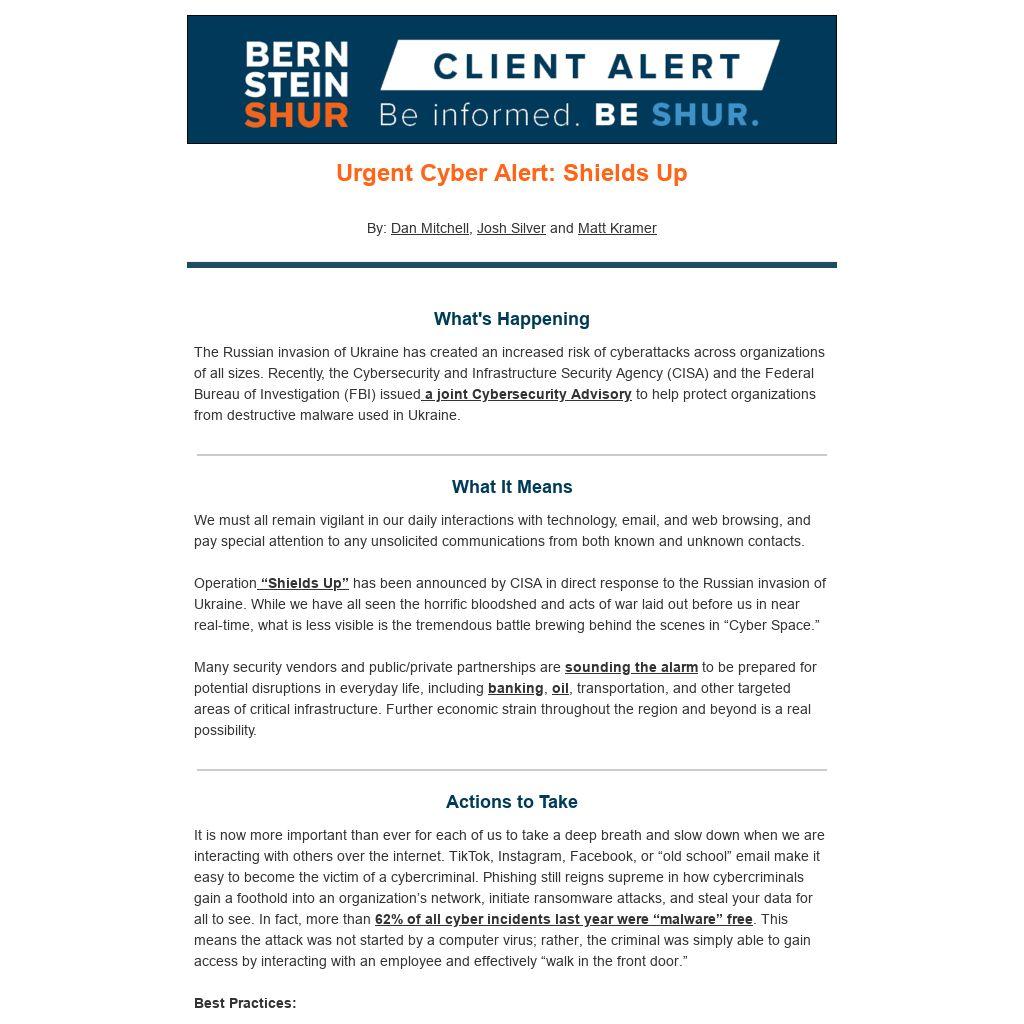 Operation “Shields Up” has been announced by CISA in direct response to the Russian invasion of Ukraine. While we have all seen the horrific bloodshed and acts of war laid out before us in near real-time, what is less visible is the tremendous battle brewing behind the scenes in “Cyber Space.”