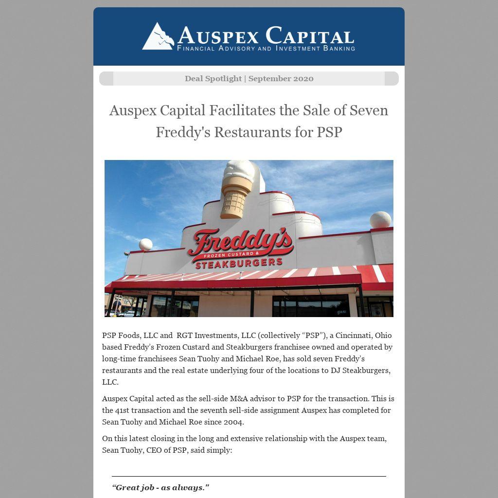PSP Foods, LLC and RGT Investments, LLC (collectively “PSP”), a Cincinnati, Ohio based Freddy’s Frozen Custard and Steakburgers franchisee owned and operated by long-time franchisees Sean Tuohy and Michael Roe, has sold seven Freddy’s restaurants and the real estate underlying four of the locations to DJ Steakburgers, LLC.