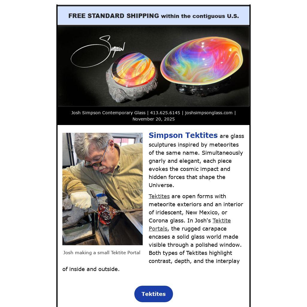Josh taught himself how to create iridescence in glass during his earliest glassblowing days, after he realized that famous glassblowers in history (calling out you - L.C. Tiffany!) could be quite secretive (actually, deceptive) when discussing their methods. So, he just figured it out for himself! Now, still fascinated by the process and the gleaming nacreous result, Josh recently made a collection of New Mexico bowls with iridescent interiors.