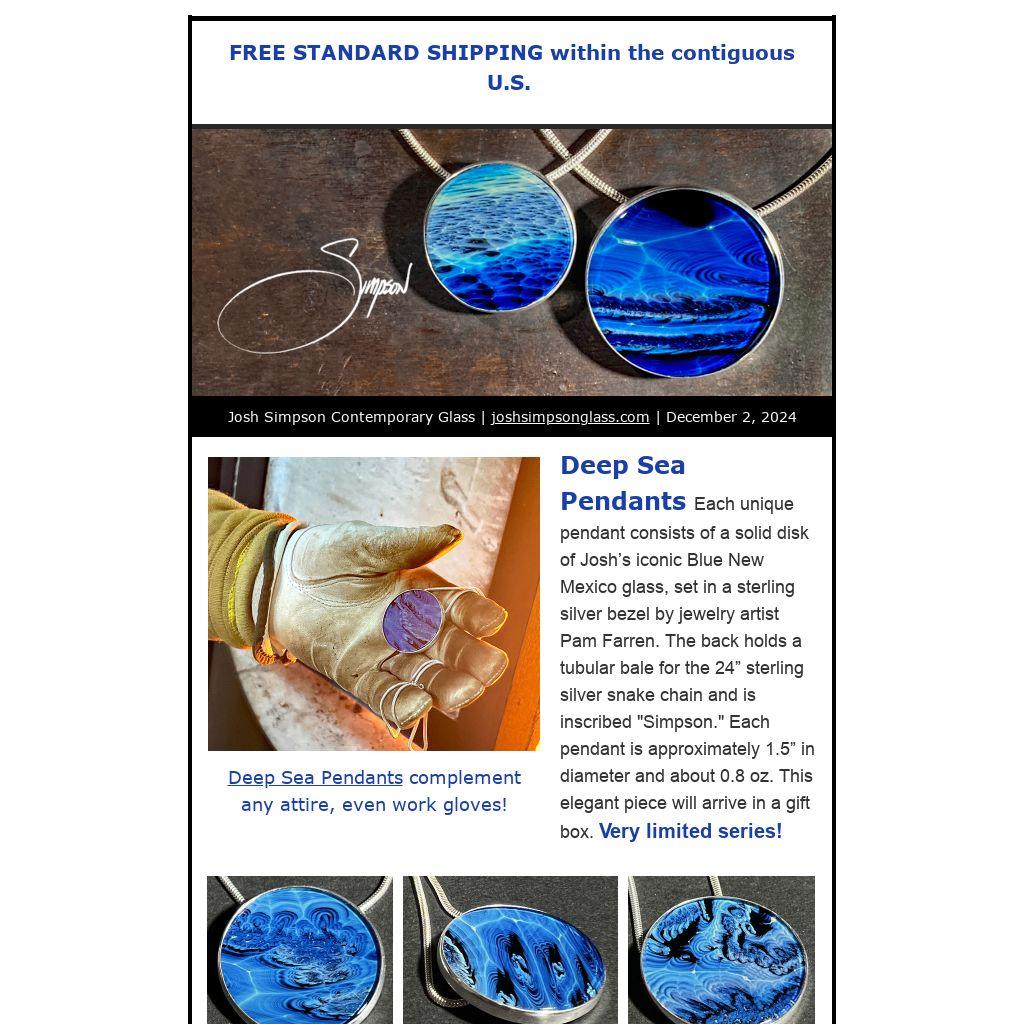 Each one-of-a-kind small vessel contains a thick layer of clear "atmosphere" around a core of classic Simpson glass, be it New Mexico, Corona, Inhabited, Swirl, or Cane. Each has a "well" for holding liquid and a tiny opening that is individually fitted with a lapground stopper, to effectively seal in any precious ethereal essence.