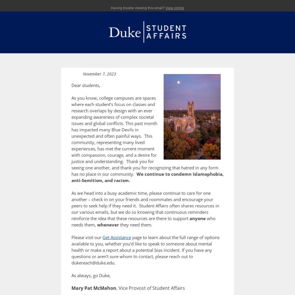 As you know, college campuses are spaces where each student’s focus on classes and research overlaps by design with an ever expanding awareness of complex societal issues and global conflicts. This past month has impacted many Blue Devils in unexpected and often painful ways. This community, representing many lived experiences, has met the current moment with compassion, courage, and a desire for justice and understanding. Thank you for seeing one another, and thank you for recognizing that hatred in any form has no place in our community. We continue to condemn Islamophobia, anti-Semitism, and racism.