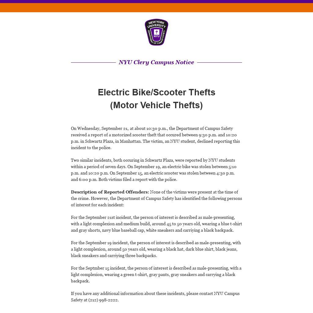 If you have any additional information about these incidents, please contact NYU Campus Safety at (212) 998-2222.