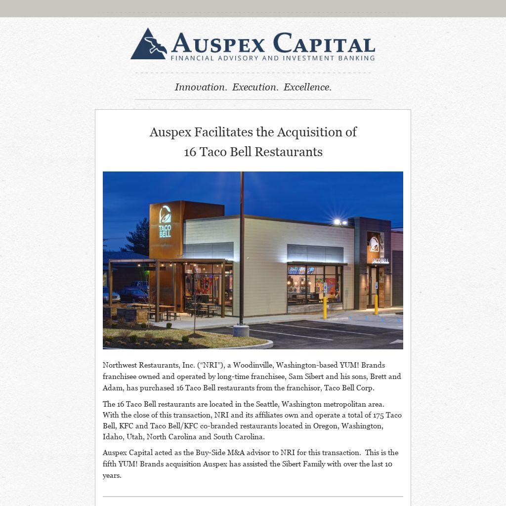Auspex Capital acted as the Buy-Side M&A advisor to NRI for this transaction. This is the fifth YUM! Brands acquisition Auspex has assisted the Sibert Family with over the last 10 years.