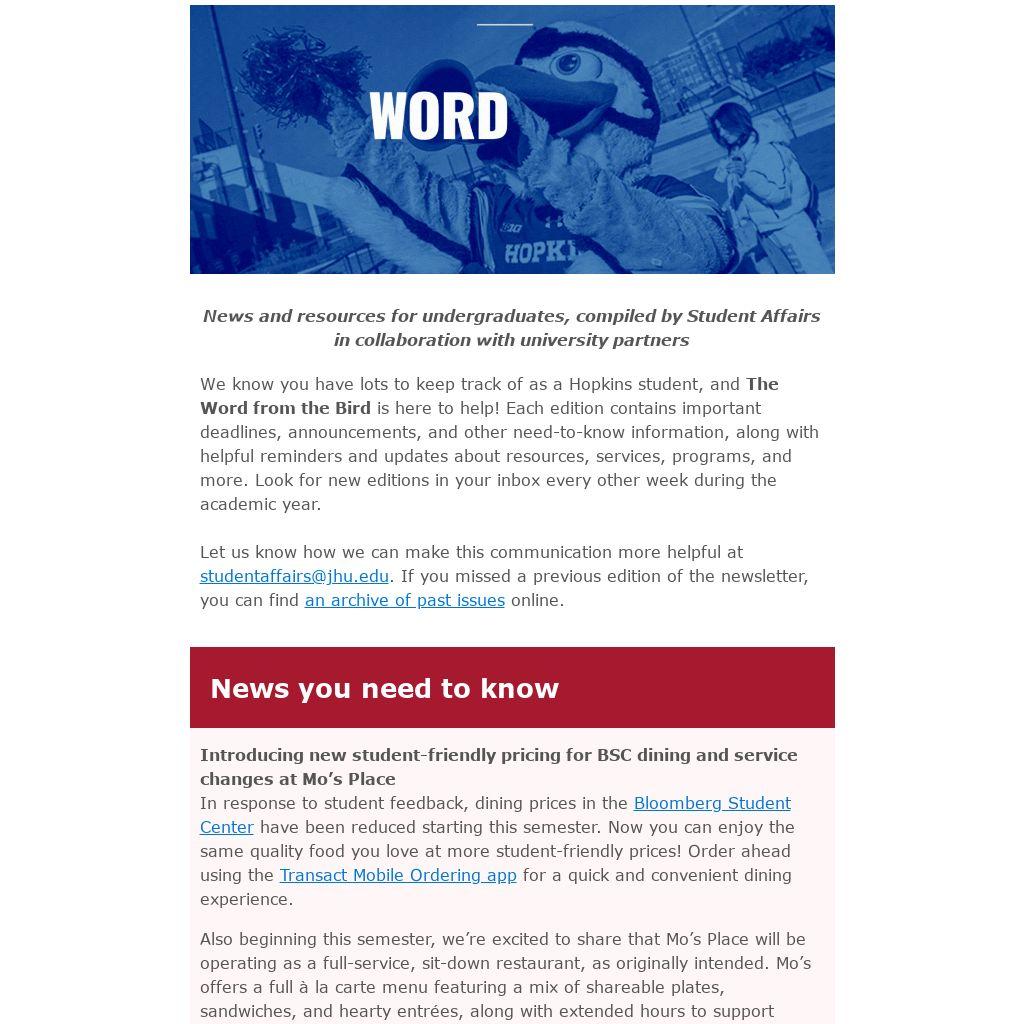 We know you have lots to keep track of as a Hopkins student, and The Word from the Bird is here to help! Each edition contains important deadlines, announcements, and other need-to-know information, along with helpful reminders and updates about resources, services, programs, and more. Look for new editions in your inbox every other week during the academic year.
