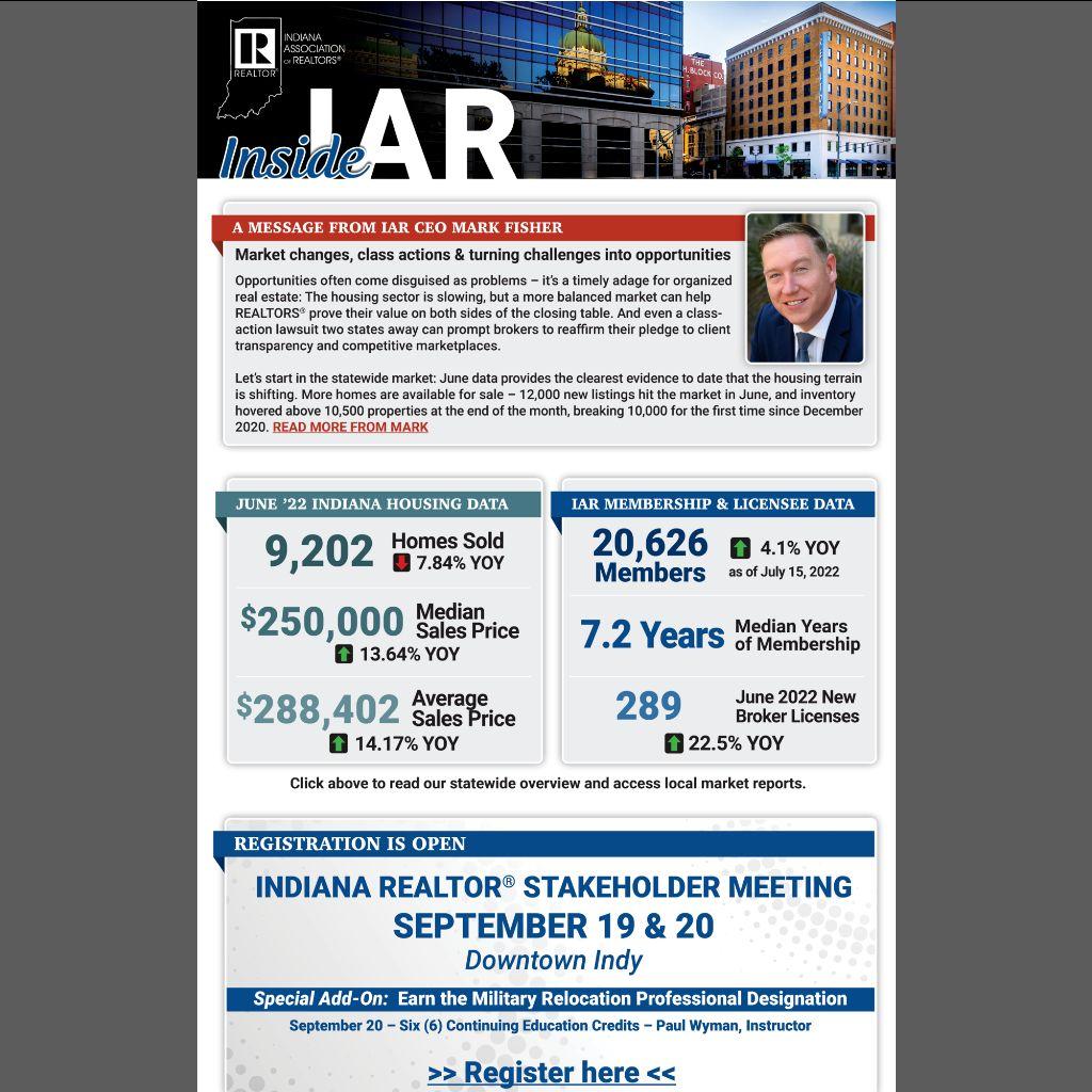 Inside IAR. This monthly newsletter is an activity report from your state association. It’s for our leaders (board members, committee members, past presidents) and the leaders (presidents, presidents-elect) and staff at our local associations. We want to empower you with information and open the lines of communication. The goal is to form more partnerships so the REALTOR® organization is the strongest it can be in Indiana. Thank you for reading and thank you for the time and talent you give to the real estate industry.