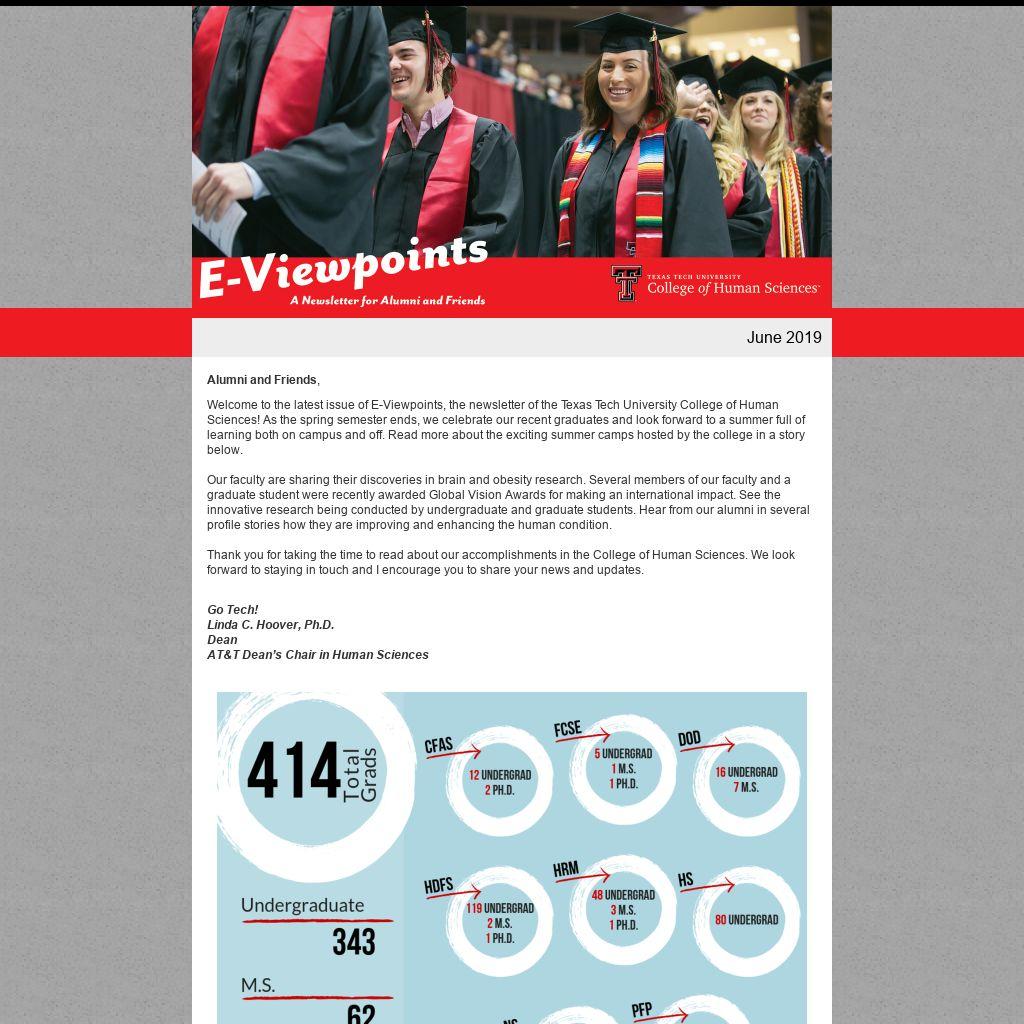 Welcome to the latest issue of E-Viewpoints, the newsletter of the Texas Tech University College of Human Sciences! As the spring semester ends, we celebrate our recent graduates and look forward to a summer full of learning both on campus and off. Read more about the exciting summer camps hosted by the college in a story below.