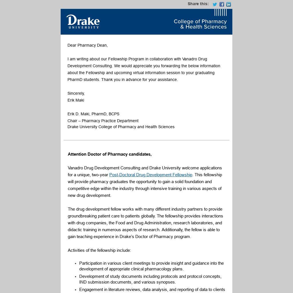 Vanadro Drug Development Consulting and Drake University welcome applications for a unique, two-year Post-Doctoral Drug Development Fellowship. This fellowship will provide pharmacy graduates the opportunity to gain a solid foundation and competitive edge within the industry through intensive training in various aspects of new drug development.