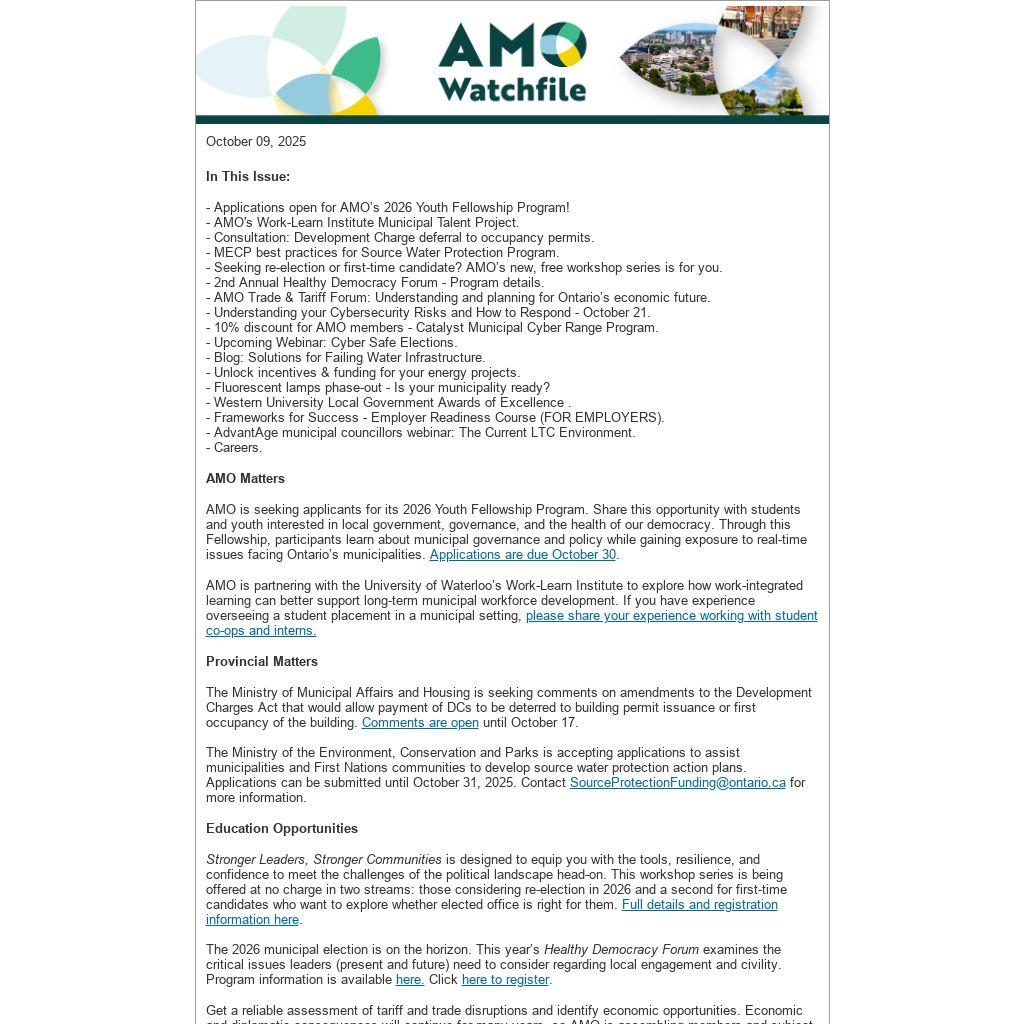 AMO is seeking applicants for its 2026 Youth Fellowship Program. Share this opportunity with students and youth interested in local government, governance, and the health of our democracy. Through this Fellowship, participants learn about municipal governance and policy while gaining exposure to real-time issues facing Ontario’s municipalities. Applications are due October 30.