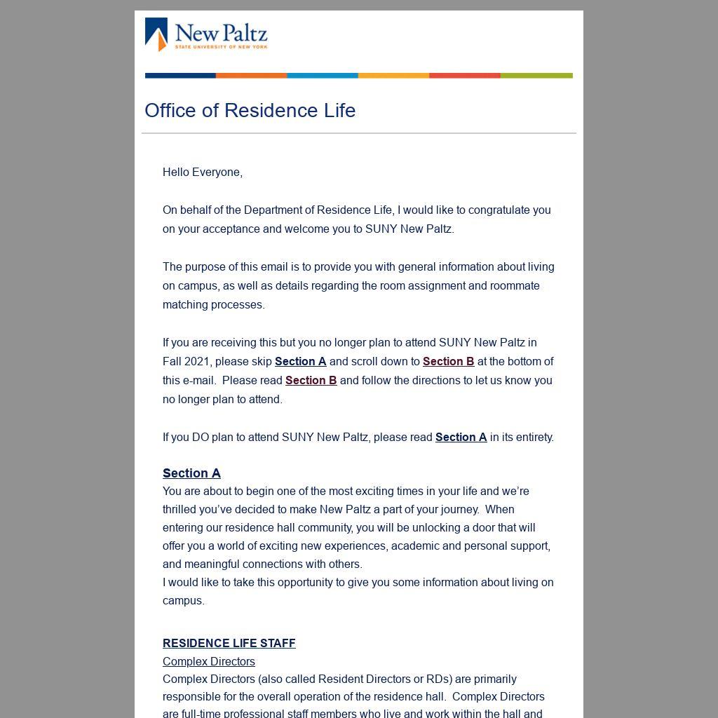 If you are receiving this but you no longer plan to attend SUNY New Paltz in Fall 2021, please skip Section A and scroll down to Section B at the bottom of this e-mail. Please read Section B and follow the directions to let us know you no longer plan to attend.