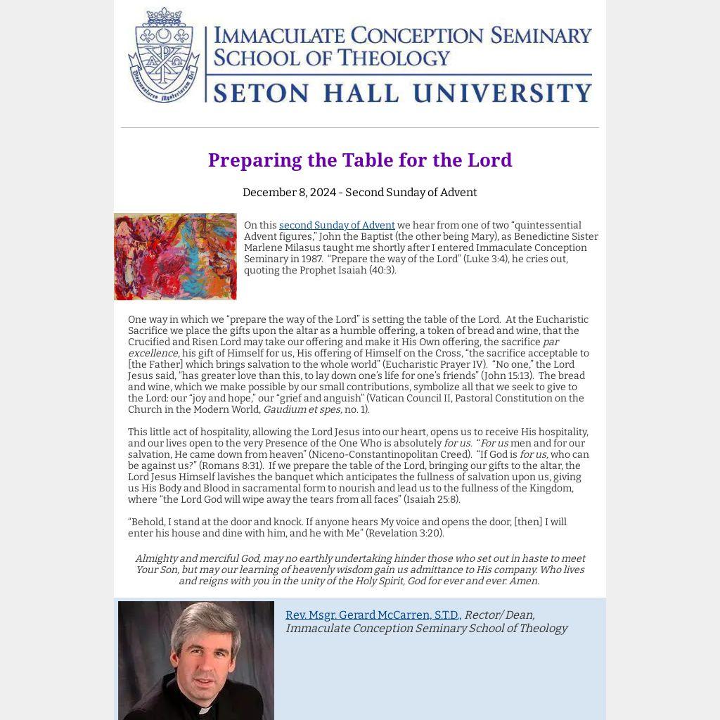 One way in which we “prepare the way of the Lord” is setting the table of the Lord. At the Eucharistic Sacrifice we place the gifts upon the altar as a humble offering, a token of bread and wine, that the Crucified and Risen Lord may take our offering and make it His Own offering, the sacrifice par excellence, his gift of Himself for us, His offering of Himself on the Cross, “the sacrifice acceptable to [the Father] which brings salvation to the whole world” (Eucharistic Prayer IV). “No one,” the Lord Jesus said, “has greater love than this, to lay down one’s life for one’s friends” (John 15:13). The bread and wine, which we make possible by our small contributions, symbolize all that we seek to give to the Lord: our “joy and hope,” our “grief and anguish” (Vatican Council II, Pastoral Constitution on the Church in the Modern World, Gaudium et spes, no. 1).