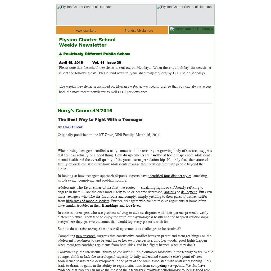 The weekly newsletter is archived on Elysian's website, www.ecsnj.org, so that you can always access both the most recent newsletter as well as all previous ones.