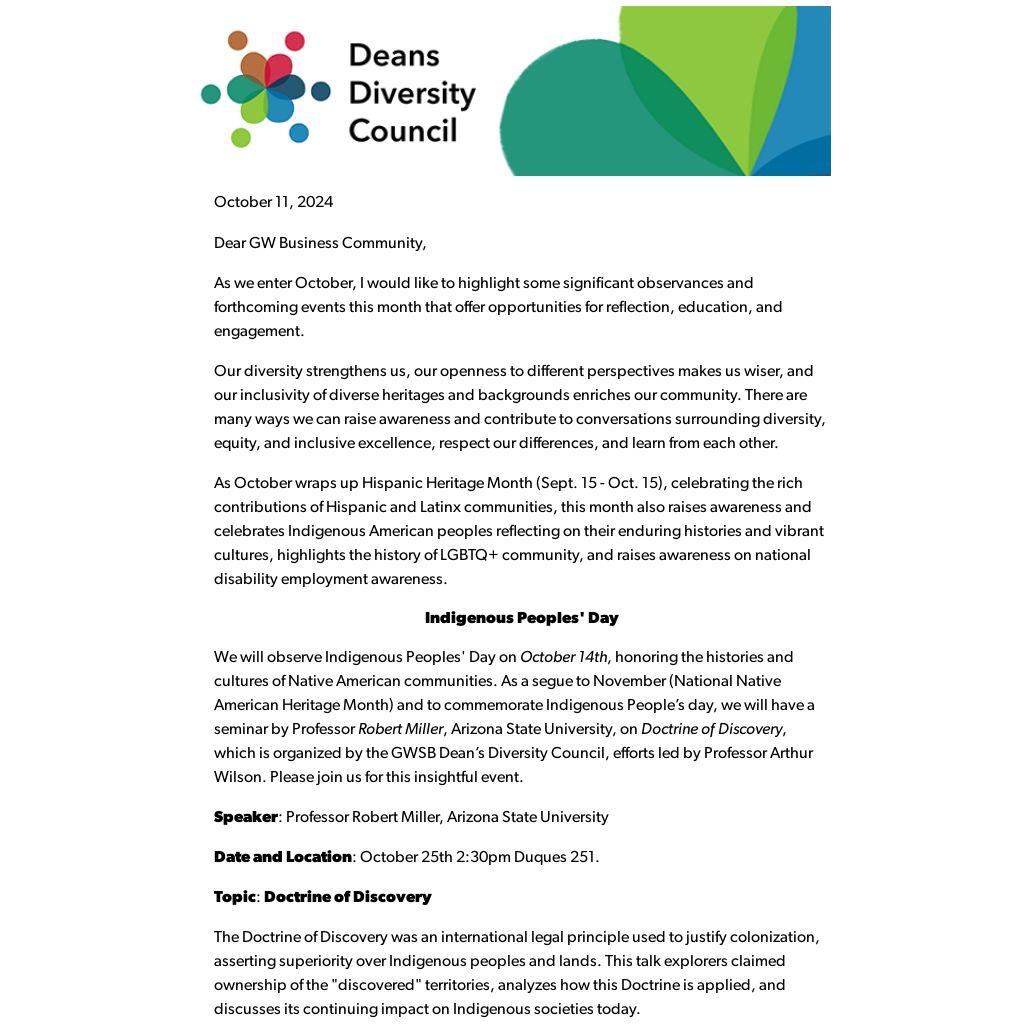 We will observe Indigenous Peoples' Day on October 14th, honoring the histories and cultures of Native American communities. As a segue to November (National Native American Heritage Month) and to commemorate Indigenous People’s day, we will have a seminar by Professor Robert Miller, Arizona State University, on Doctrine of Discovery, which is organized by the GWSB Dean’s Diversity Council, efforts led by Professor Arthur Wilson. Please join us for this insightful event.